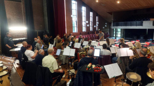 Peter bereitet die Musikerinnen und Musiker mit den Musikstücken auf das Konzert vor (Tenorhörner, Posaunen).
